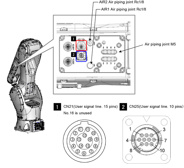 连接内置在机器人的电磁阀(机器人内置电磁阀)口。 向机器人内置电磁阀供气从连接器面板的AIR1进行。关于机器人内置电磁阀的规格,请参照这里。 |
