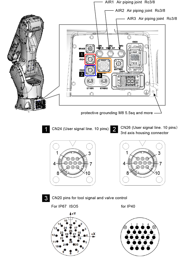 与连接器面板的CN20直接连接。 用于将信号线连接至工具。 连接此连接器的电缆侧连接器附带在机器人上。但是,连接器插头不可连接电缆。将电缆连接到连接器插头时,需要客户另外连接。 |