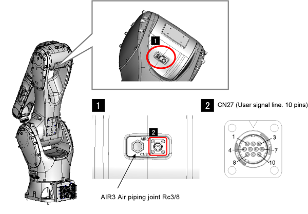 与工具配线面板的CN27直接连结。 用于将连接到工具的信号线连接至机器人控制器或PLC等。 连接此连接器的电缆侧连接器(CN27用连接器)附带在机器人上。但是,CN27用连接器不可连接电缆。将电缆连接到CN27用连接器时,需要客户另外连接。 |