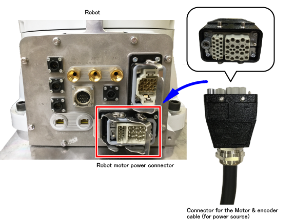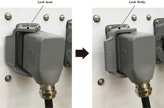 将本体之间电缆(动作用)的灰色连接器垂直插入机器人动力连接器,并操作2个锁定杆锁定。