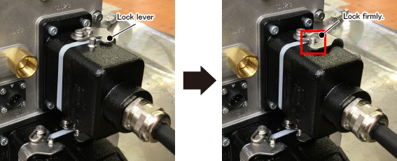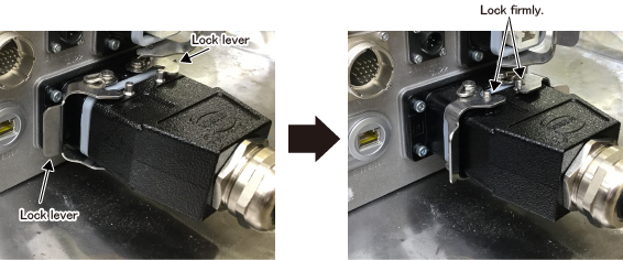 将本体之间电缆(动作用)的黑色连接器垂直插入机器人动力连接器,并操作2个锁定杆锁定。