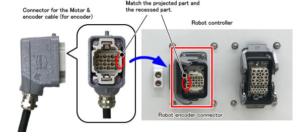 确保本体之间电缆(编码器用)的黑色连接器和机器人编码器连接器的左右朝向(连接器内部的凸起部和凹陷部)一致。