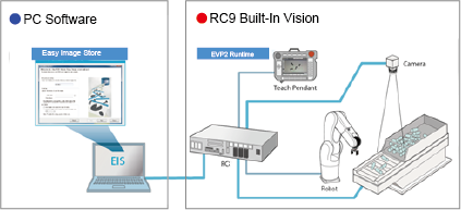 | EIS | EIS is a software that stores RC8 series-connected camera images into a computer. Images taken by Built-in Vision (EVP) are temporarily stored in robot controller (hereafter, RC8 series), and reset by the controller power-off. By using EIS, these images are automatically stored in your computer as image files.