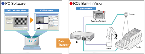 | EVP2 | EVP2 is a software that supports necessary configurations for image processing without programming when a robot corrects its position with a vision device. This software offers enhanced functionality and several times greater processing power than the EVP application, while maintaining the same ease of operation. Images are processed with a camera connected to the controller. To set the image processing, EVP2 Guidance is used. This application will be installed in the computer. When in operation, only controller and a camera connected to controller can be operated. To correct robot’s position with a vision device, Camera-Robot calibration should be executed. Users can use calibration wizard which is included in EVP2 Guidance for this calibration. Also, EVP2 equips a function to output the parts distribution status in the detection area. Using this function enables you to control parts movement with any customer-prepared device, such as a feeder.