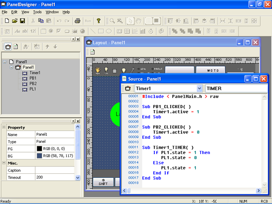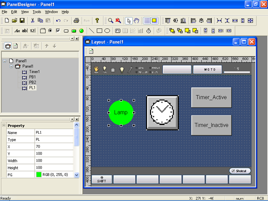 Load the editor and place a timer, two buttons, and a pilot lamp on the panel layout in the Layout window.