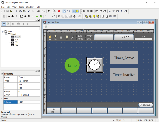 To specify the timer interval, change the value of Interval at Property. The unit is ms.