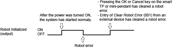- A robot error is cleared by the OK or Cancel key on the smart TP or mini-pendant or by Clear Robot Error (001) after this signal has been turned OFF.