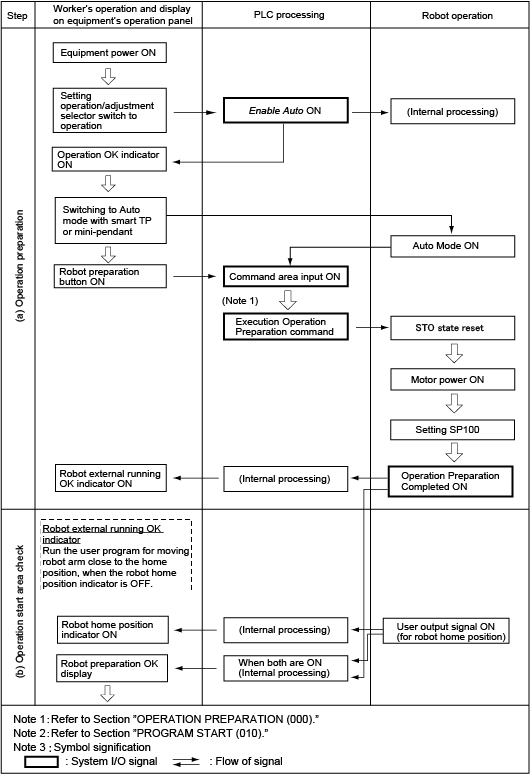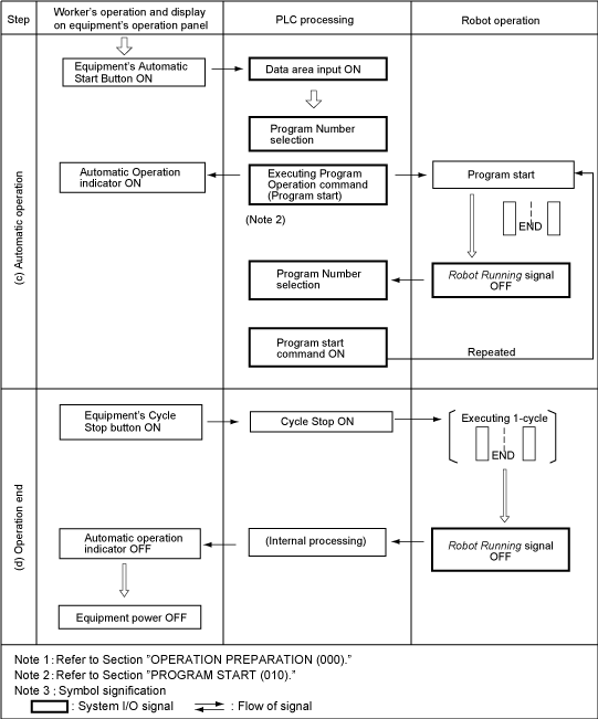 The following pages show the relationship between the system I/O signals for start and stop, worker’s operation, display on the equipment operation panel, PLC proceeding, and robot motion.