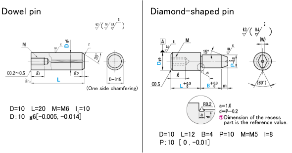 定位销钉和菱形销钉与机器人同箱包装。各销钉的尺寸如下图所示。