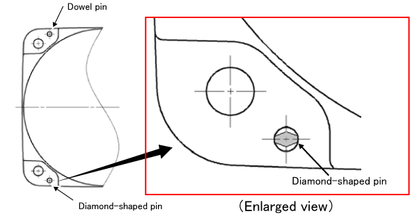 使用菱形销钉时,请注意菱形销钉的朝向。如下图所示,请确保菱形销钉的螺牙朝定位销钉一侧。