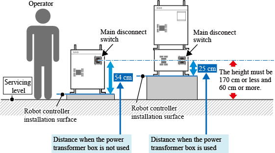 因此,安装机器人控制器的高度需要确保机器人控制器主断路器距离作业面60cm以上,170cm以下。