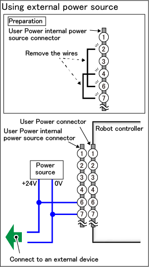 将连接到电源及外部机器的电缆线焊接到User Power 内部电源连接器的6号引脚和7号引脚。根据需要,用热收缩管使焊接部位绝缘。
