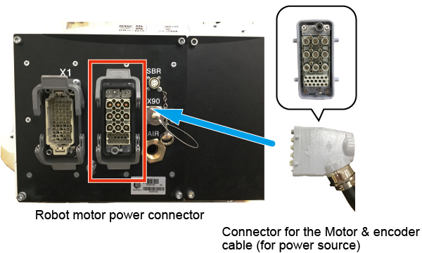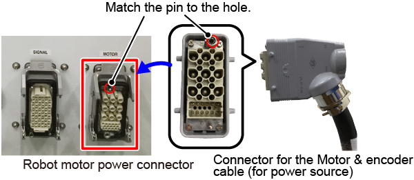 确保本体之间电缆(动作用)的连接器和机器人动力连接器的上下朝向一致。