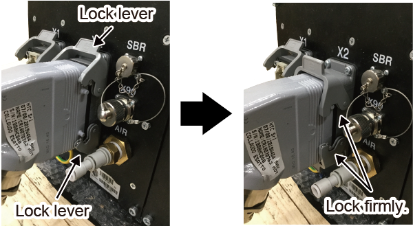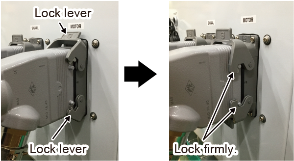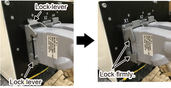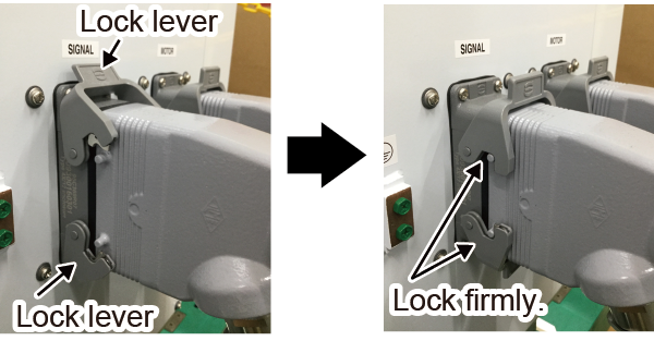 将本体之间电缆(动作用)的连接器垂直插入机器人动力连接器,并操作2个锁定杆锁定。
