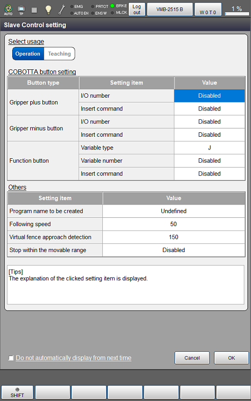 | Variable number | Disabled | Set the variable number to record the current position when pressing the function button of COBOTTA. If "-1" is set, it is disabled. | |