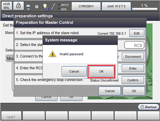 If an error occurs, the Ethernet cable may not be connected correctly or the IP address of the connected slave robot may be wrong.