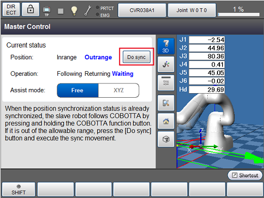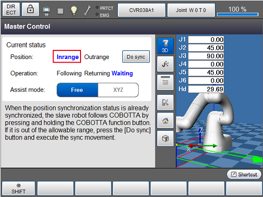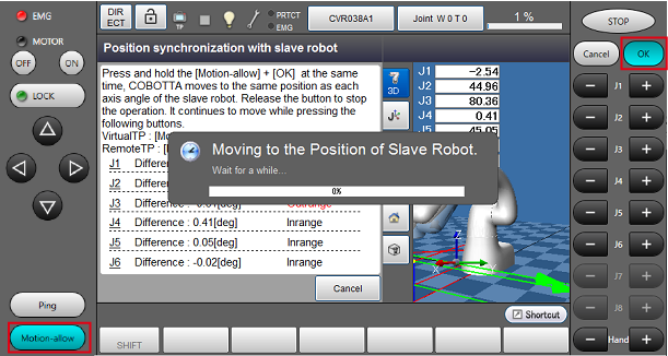 Make sure that there are no obstacles around COBOTTA. By pressing [Motion-allow] - [OK] in the window for synchronizing positions with the slave robot, COBOTTA moves. Keep pressing [Motion-allow] and [OK] until it reaches 100%.