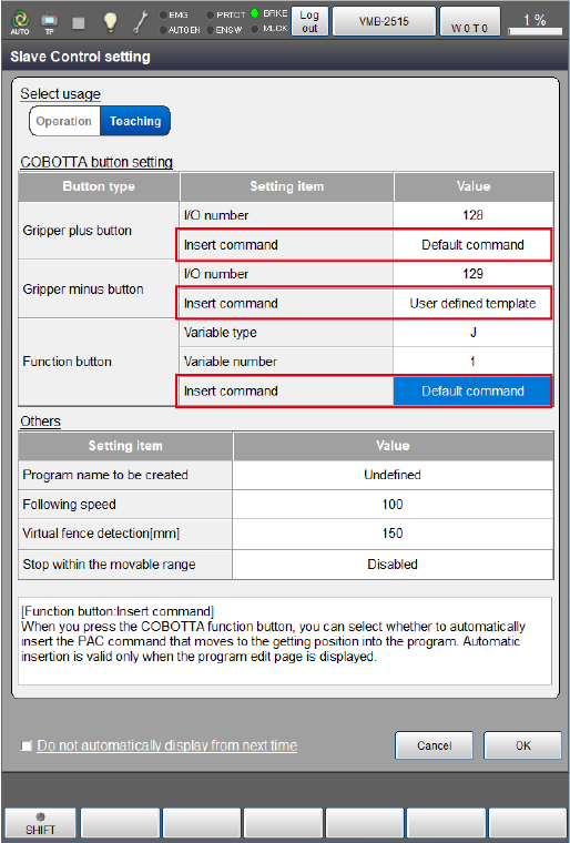 Set to "Default command" or "User defined template" for the setting value of [Insert command] of each button in the slave control setting window of the slave robot.