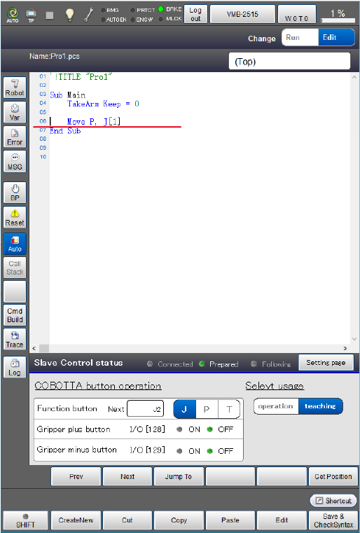 With the program edit window is displayed, when you press each button of COBOTTA, the specified command is automatically inserted.