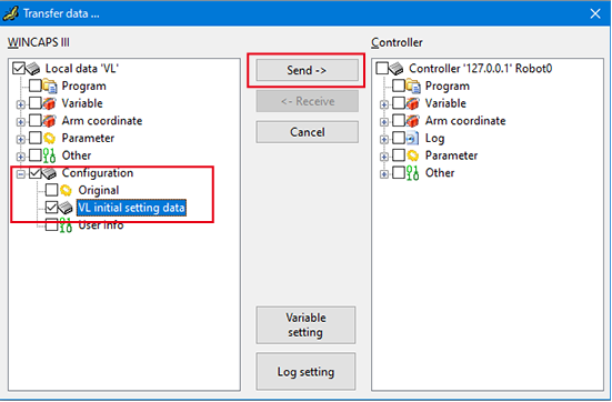 在打开的[发送接收数据]画面勾选“VL初期设定数据”,单击发送按钮。