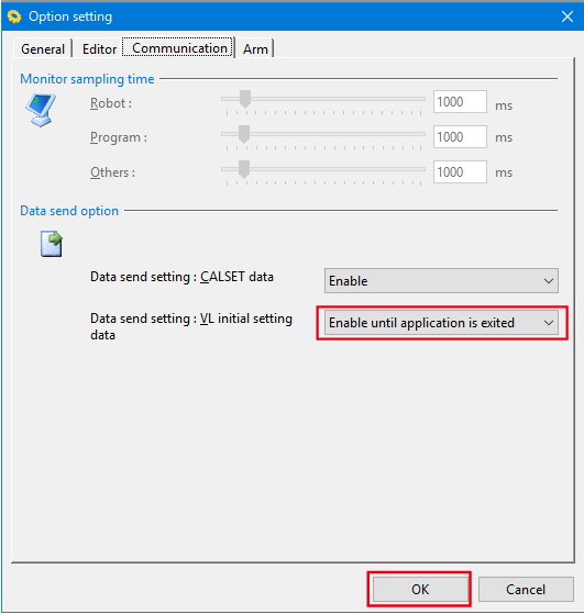在打开的[选项设定]画面,将[通信]标签中的 [VL初期设定数据]设成“允许至应用程序结束”,单击[OK]。