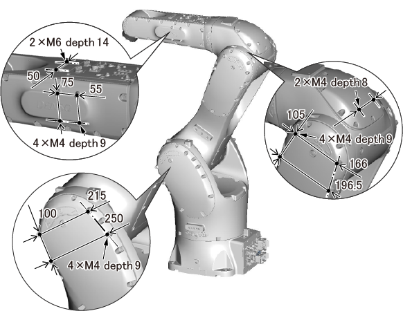 为了将配线·配管固定在臂、本体上,有可使用的螺纹孔。