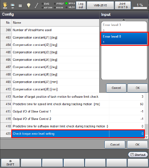 Change [420 : Check torque error level setting] of "Config" from "0: Error level 3" to "1: Error level 0" and press the [OK] button.