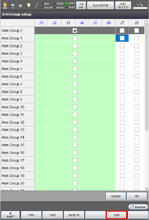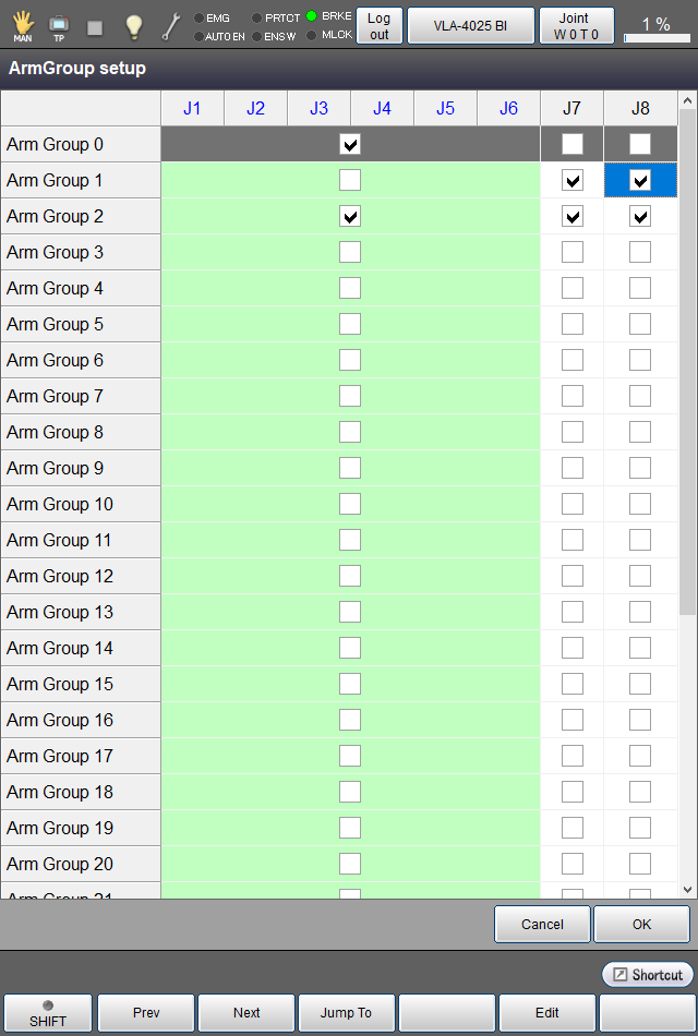 Auxiliary axes that you want to enable in an arm group need to be set to "Enabled" in the "Joint enable/disable setting" on the [Servo Amp] setting window beforehand.