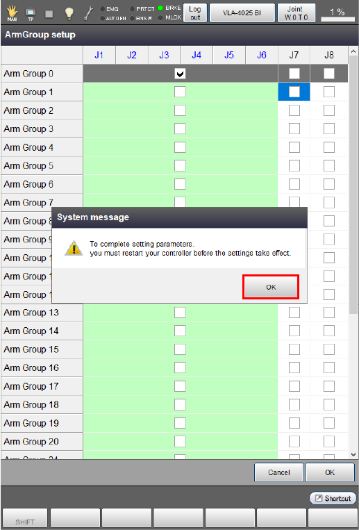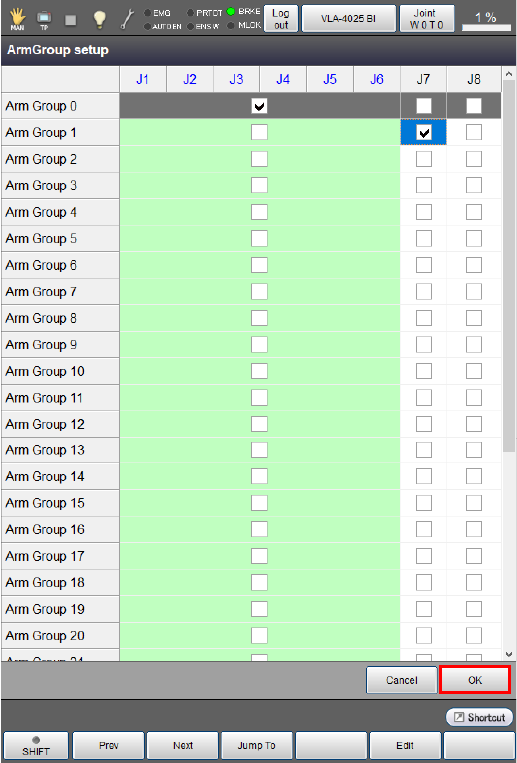 After all arm group settings are completed, press [OK] on the [Arm Group setup] window.