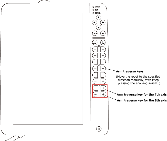 To move an auxiliary axis, press any of the arm traverse keys for the target axis while holding down the enabling switch.