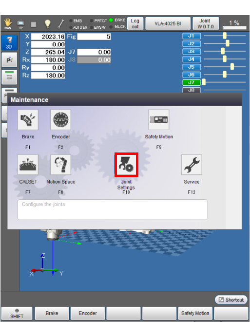Operation path: Top screen -[F2 Arm]-[F12 Maintenance]-[F10 Joint Settings]