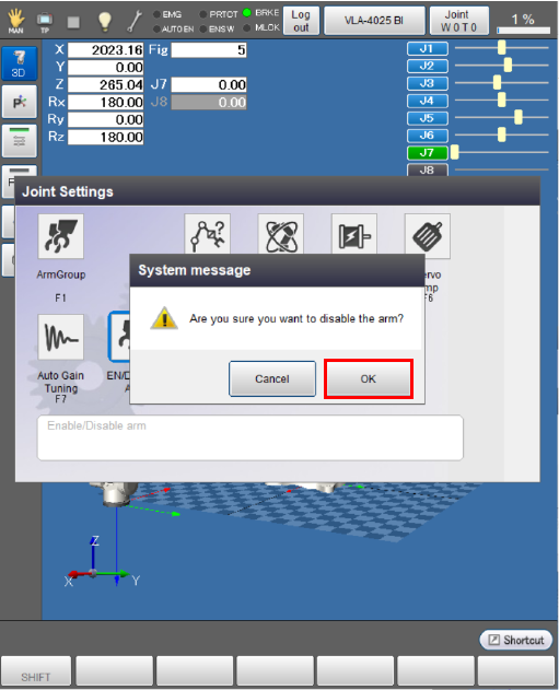 System message appears to confirm whether to disable the robot arm, then press [OK] to disable the robot arm.