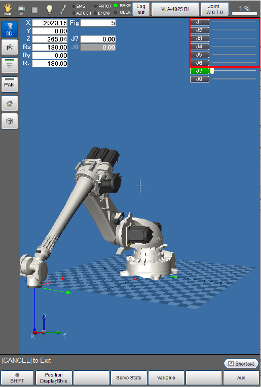 If the setting has changed properly, the position information bar shown on the upper right of the window turns to gray, which means the robot arm is disabled. In this example, J1 to J6 are gray.