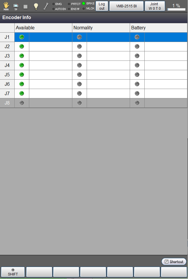 Call up the [Encoder Info] window. Check the boxes preceding auxiliary axes are green (normal).
