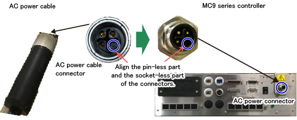 将电源电缆的连接器插入MC9系列控制器的AC电源连接器。此时,请将AC电源电缆的引脚和AC电源电缆的连接器插口对准。此外,请向深处插入AC电源电缆的连接器。