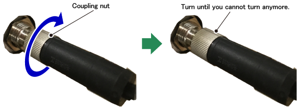 朝MC9系列控制器向右侧转动AC电源电缆的联轴器螺母。中途不旋转,因此请旋转到此处。连接器锁定。