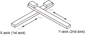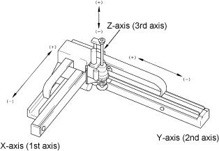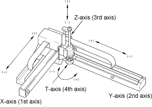 机器人轴根据轴数,第1轴~第4轴形成如下图所示直角坐标时,可以使用和CP动作(直线、圆弧动作)等和机器人相同的命令进行操作。