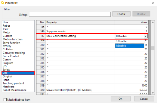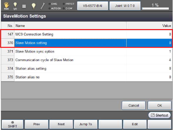将[147:MC9连接设定]、[370:SlaveMotion设定]设为[1:有效],按下[OK]。
