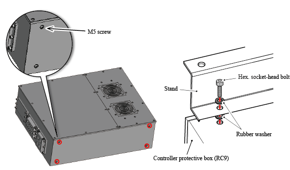 接着,用底座套件上附带的橡胶垫圈和内六角螺栓,固定控制器保护箱(MC9)和底座。将橡胶垫圈夹进底座的两面(参照下图),用内六角螺栓固定4个螺纹孔(φ6.5)。