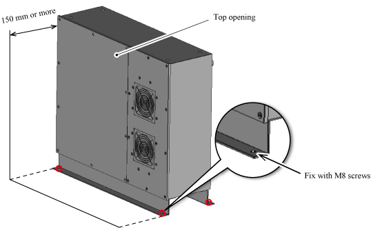 将固定了底座的控制器保护箱(MC9)放在设置位置。与水平设置时相同,请距离上面开口部150mm以上。