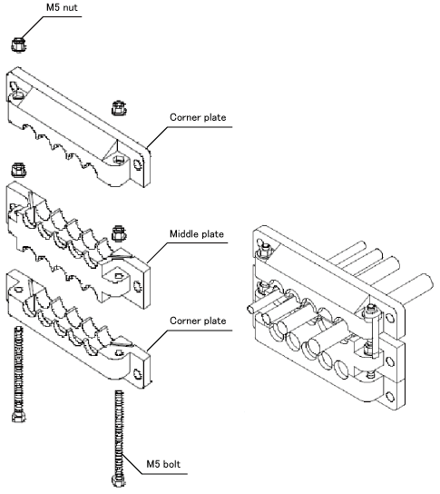 将电缆穿过中间盖板和棱角盖板的盘根的R部位并上下夹紧。