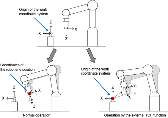 For example, in the normal operation, a robot changes its posture with the robot end kept at the same position by moving the arm around the origin of the robot end coordinates (the origin of the tool coordinate system). Unlike the normal operation, the external TCP function allows the robot arm to move around the origin of the work coordinate system.