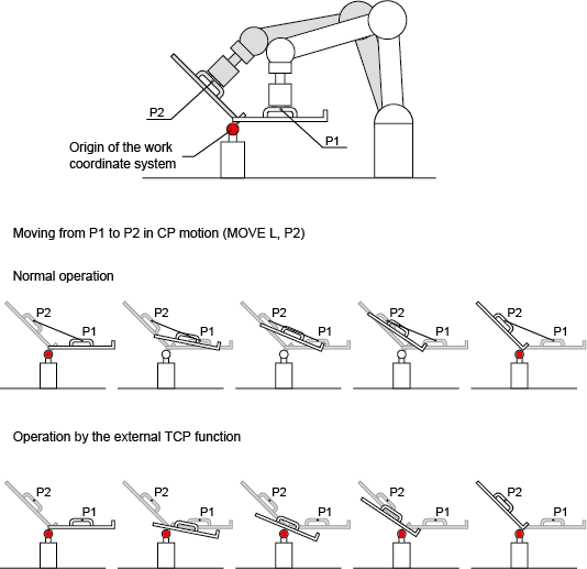 In the normal robot operation, you need to specify the position to which the robot end will be moved, whereas the external TCP function allows you to specify the position to which the origin of a work coordinate system will be moved.