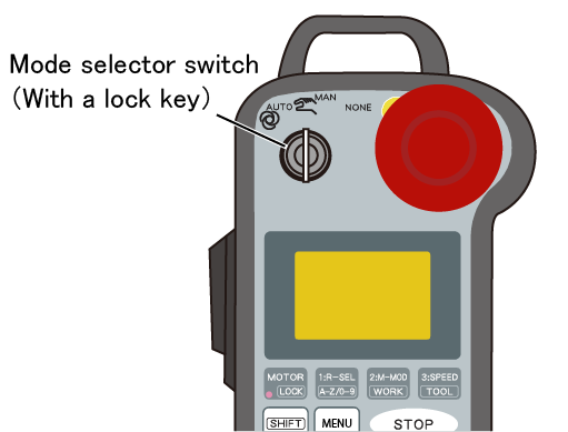 但是,机器人控制器的软件版本为1.4.*之前时,如将钥匙切换到[NONE] ([OPTION]) 位置,则运行模式变为手动模式。