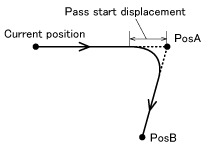 在位置指定的通过动作中,如果不指定“@[通过起始位移量]”而指定“@a[通过起始位移量]”,则当前位置(编码器值)和目标位置之间的距离接近指定数值时执行下一行指令。