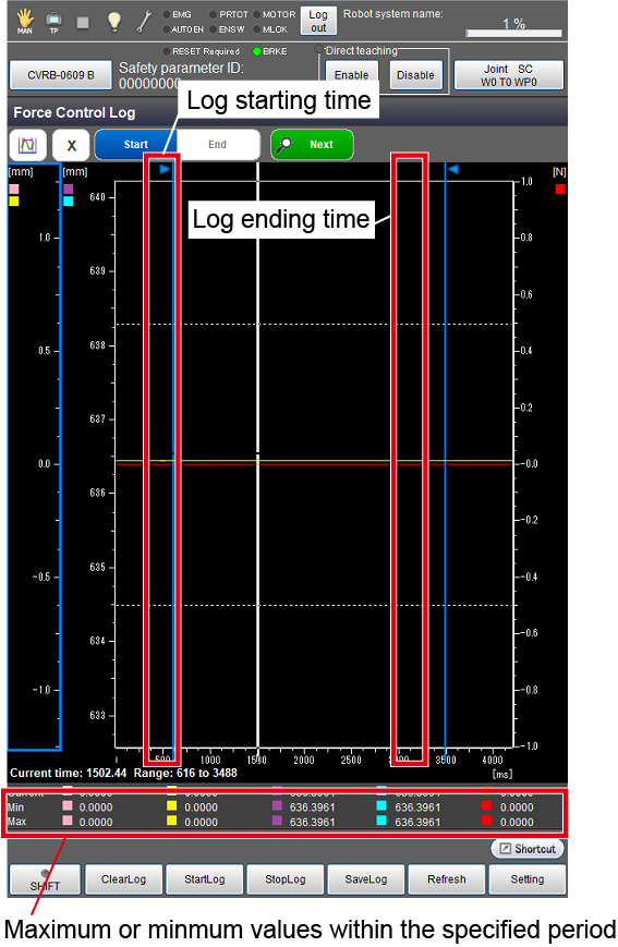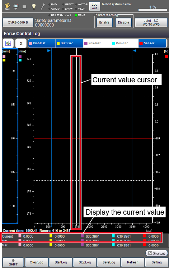 力量控制Log或传感器值的监视画面中显示的值为修正后的值,因此可能与力感应器的实际检测值不一致。因此,即使实际检测值未超出指定值,画面中也可能显示超出值。相反,即使实际检测值超出指定值,画面中也可能显示未超出值。
