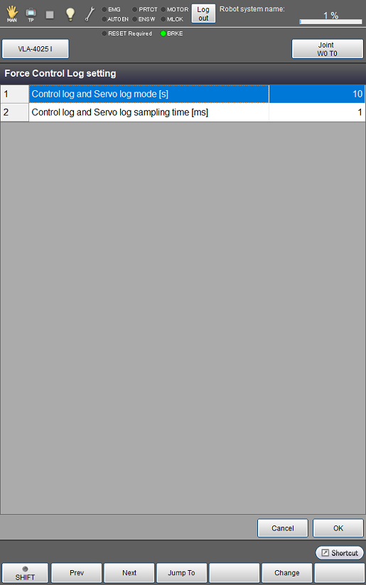 操作路径:[F2 机械臂] - [F2 力量控制] - [F2 力量控制Log] - [F6 设定]